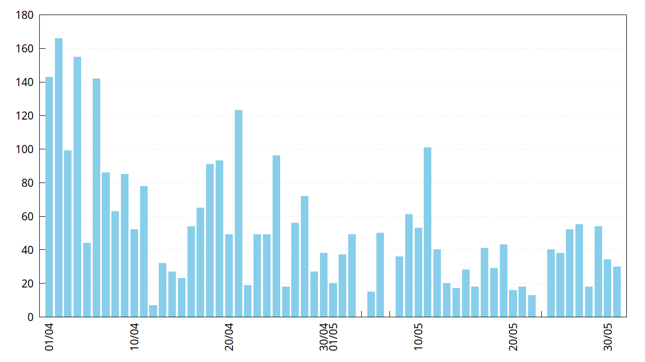 Sur l’image ci-dessous tu peux voir le nombre de recherches d’adversaire par jour sur les mois d’avril et mai :