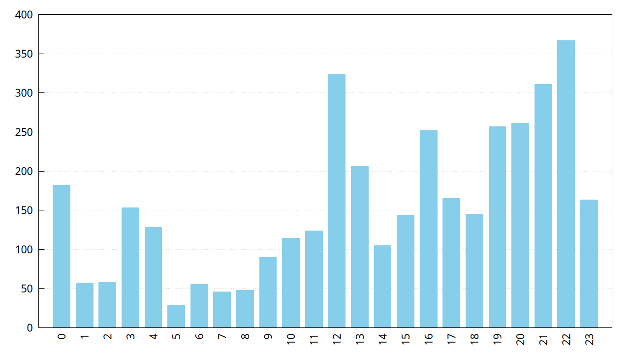 Si on regarde le nombre de recherches d’adversaire par heure (UTC) on peut avoir une idée des moments où on a le plus de chance de trouver quelqu’un.