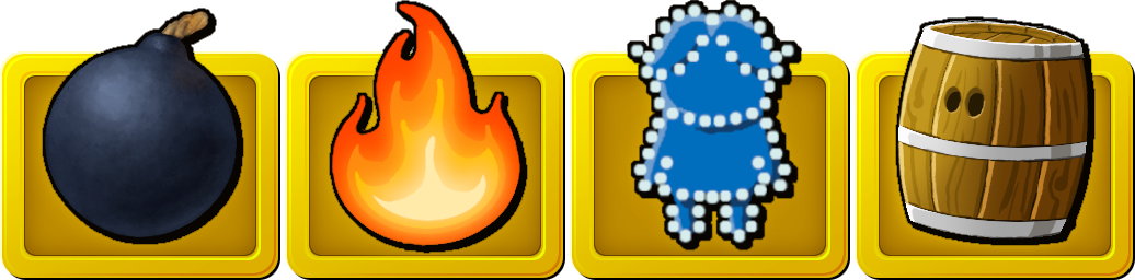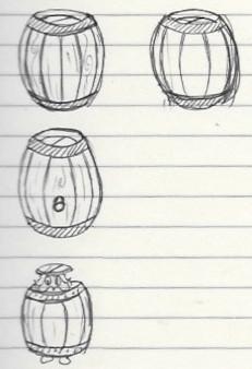 Je trouve intéressant de comparer la démarche avec celle suivie pour dessiner le tonneau bouclier. Point d’IA pour celui-ci, je suis parti de ce que je savais (j’ai une vague idée de ce à quoi ressemble un tonneau) puis j’ai effectué une recherche d’images sur le thème « cartoon barrel ». Ensuite j’ai étudié les résultats pour en extraire des caractéristiques qui me conviennent (couleurs mais aussi nombre de planches et de cerclages). Et voilà, j’ai dessiné du mieux que je pouvais ce que j’avais en tête et c’est tout. Est-ce très différents de la démarche pour les bonus ? Au final je me suis inspiré de travaux de tiers pour faire quelque chose à ma sauce.