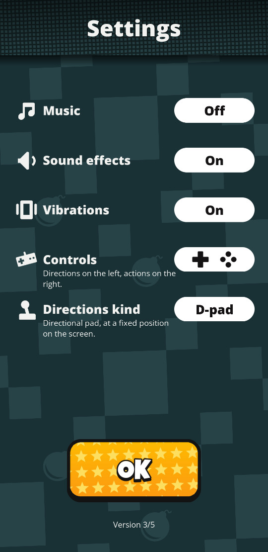 En dehors des réglages classiques d’effets sonores, de musique, et de vibrations, le joueur peut aussi y choisir la disposition des boutons. L’intention initiale est d’avoir un mode gaucher et un mode droitier mais personne ne viendra vérifier quelle est votre main dominante. Mettez-donc la disposition que vous trouvez la plus pratique.