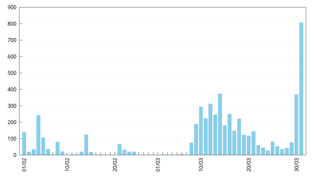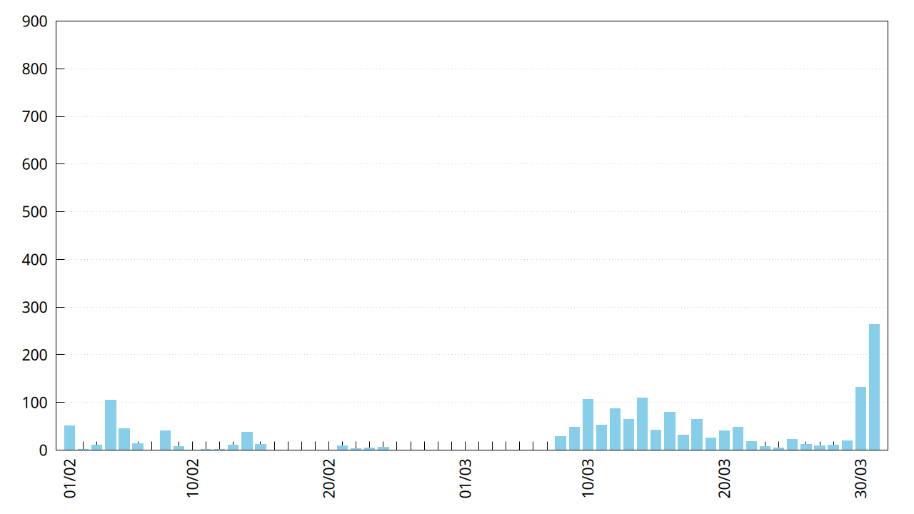 Niveau dates importantes, on a le dernier journal le 1er février, ensuite la version F-Droid a été acceptée le 5 mars et a du se propager vers le 8, et enfin la version PlayStore a été publiée le 11 mars. Voyons un peu ce qu’on trouve dans les logs sur les mois de février et mars, à commencer par le nombre de personnes qui souhaitent jouer :