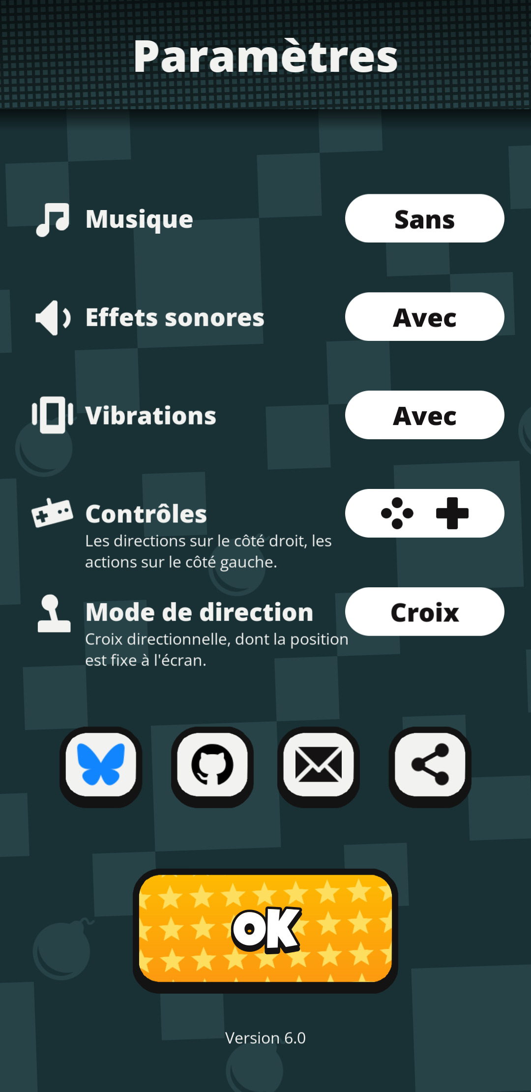 L’écran de paramètres a reçu de nouveaux boutons pour me joindre, par e-mail ou sur Bluesky (j’y poste parfois des infos sur le dev), un bouton pour retrouver le projet sur GitHub, et un bouton pour inviter des contacts à essayer le jeu.